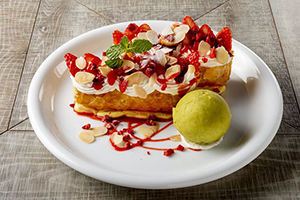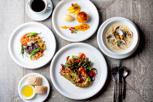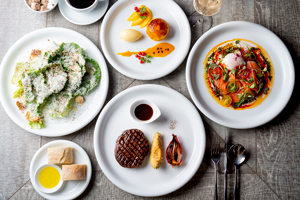 お食事は名物のシーザーサラダやニューイングランドクラムチャウダーから、オマール海老などのシーフード、様々な産地から厳選したビーフを使用したグリル料理、パティシエこだわりのデザートまで堪能いただけます。また、ソムリエがセレクトしたニューワールドやフランス、イタリアのワインも合わせてお楽しみいただけます。